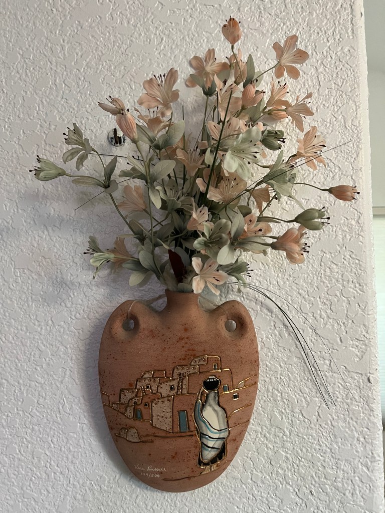 Signed by the artist, this ceramic canteen is 149/500. Known for using 22K gold inlay, this ceramic sculpture is in pristine condition. Vera Russell passed away in 2021 and her art remains ultimately collectible.