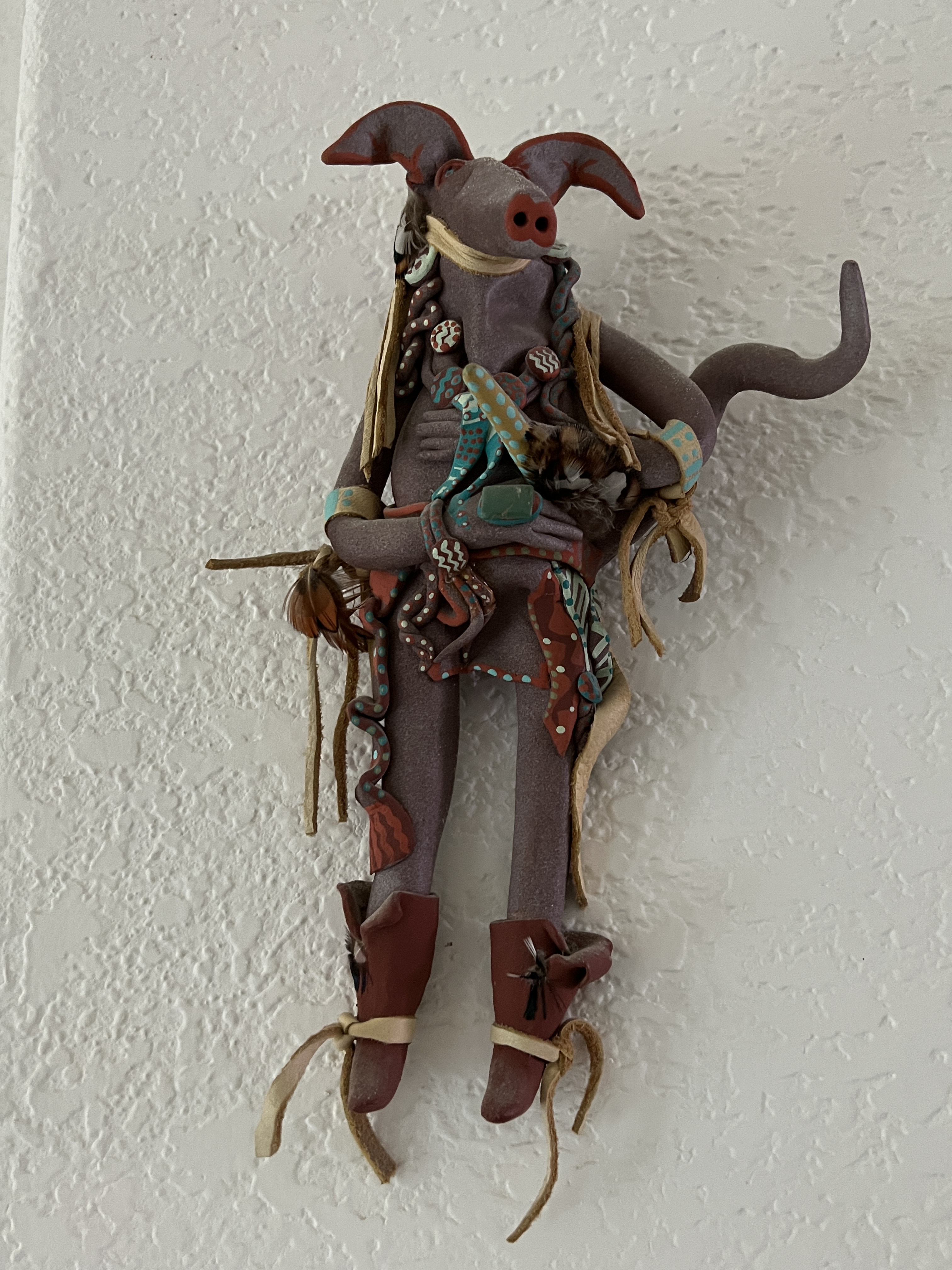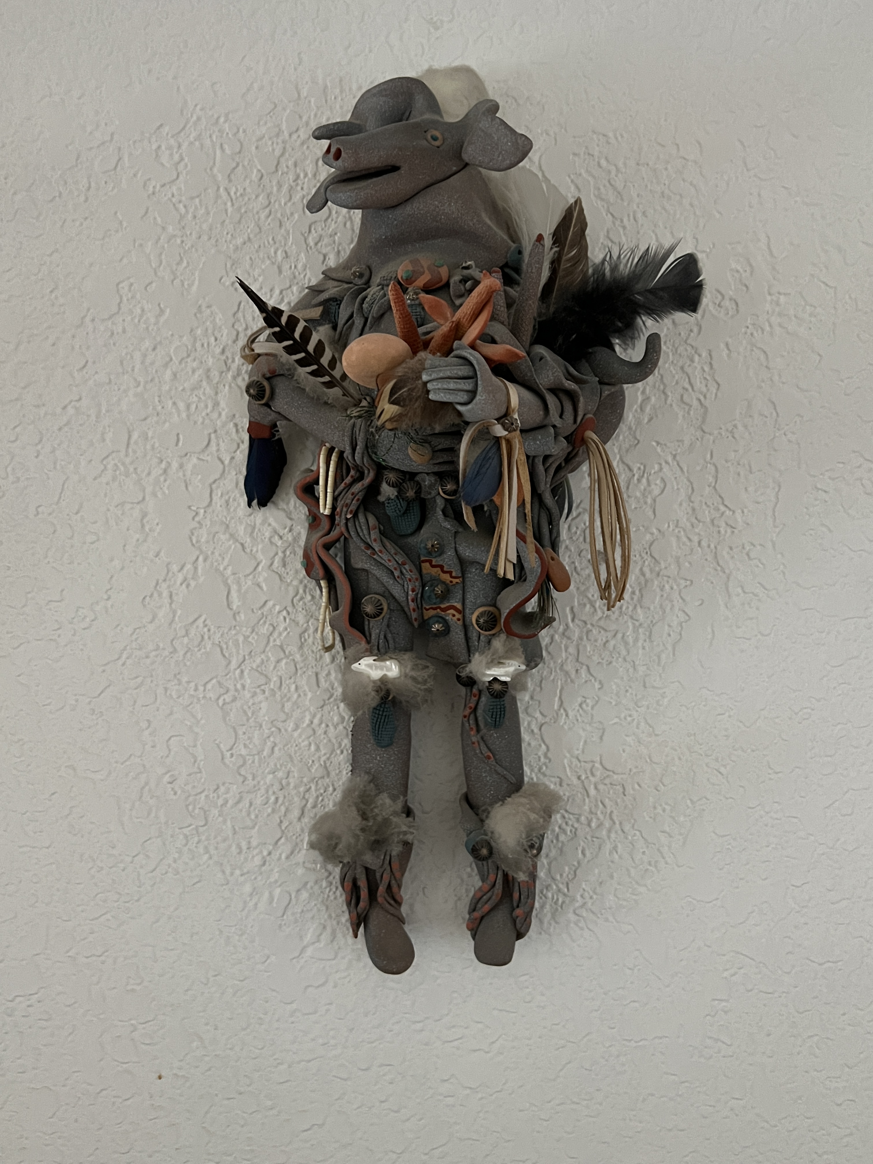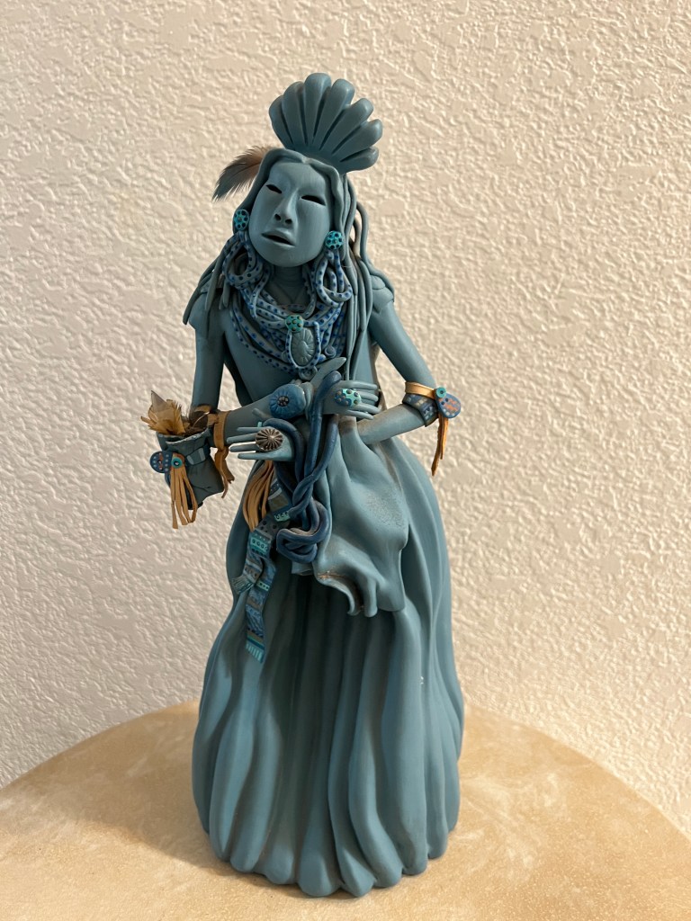 Her clay sculptures are expressions of her Navajo heritage and feature cultural mythology. Renate’s collection is comprised of the Turquoise Lady and seven smaller clay sculptures featuring deities as well as one ceremonial clay pouch to carry fetishes and whimsical clay snakes. All clay sculptures are in pristine condition. Additionally, Renate has a copy of the Beyond Tradition book with the artist’s signature.