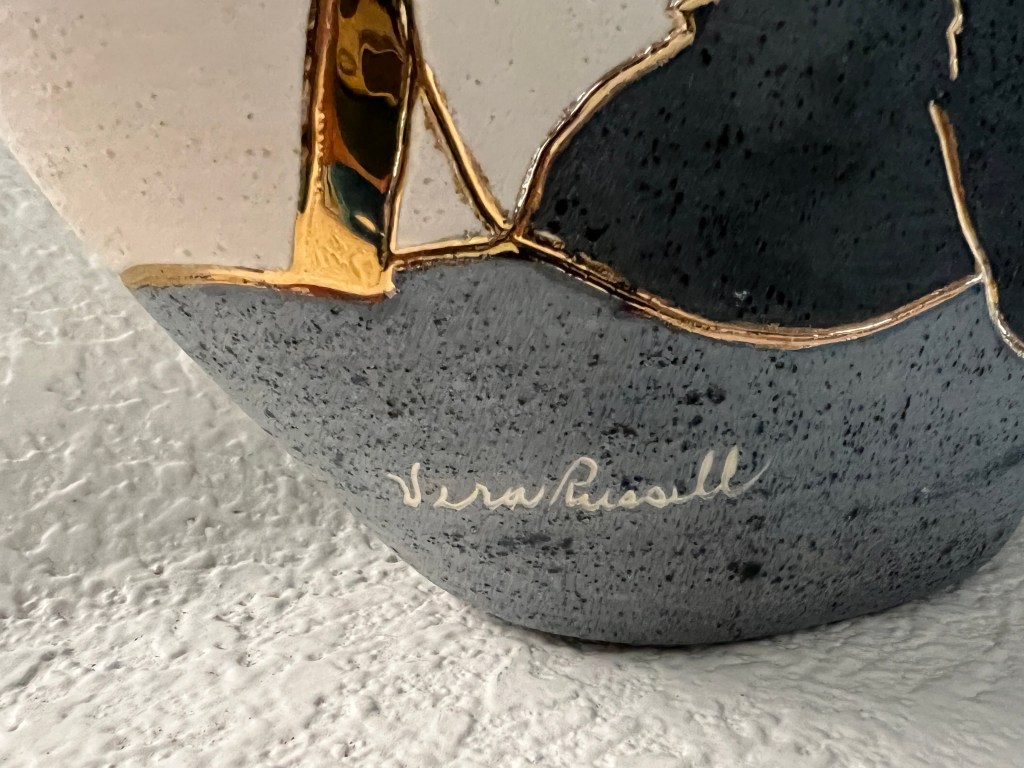 Panda Ceramic Sculpture by Vera Russell Vera Russell’s ceramic sculpture features a panda amid a 22K gold bamboo forest. 1 of 100 made.Approx 11.25″ H x 11″ W